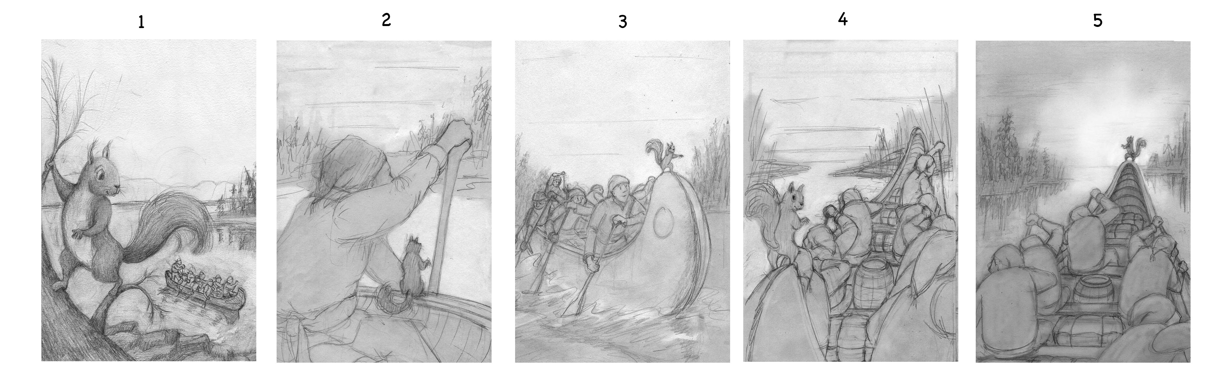 Next, I drew larger rough sketches. One of the struggles with this cover was how to highlight the main character, the squirrel, who also happens to be the smallest character. In addition, it was important to include the canoe and the men paddling. After drawing many versions and trying various angles, these were the five sketches I sent to Holiday House.