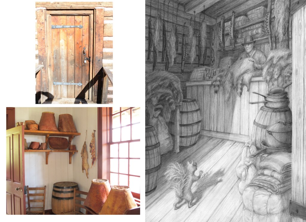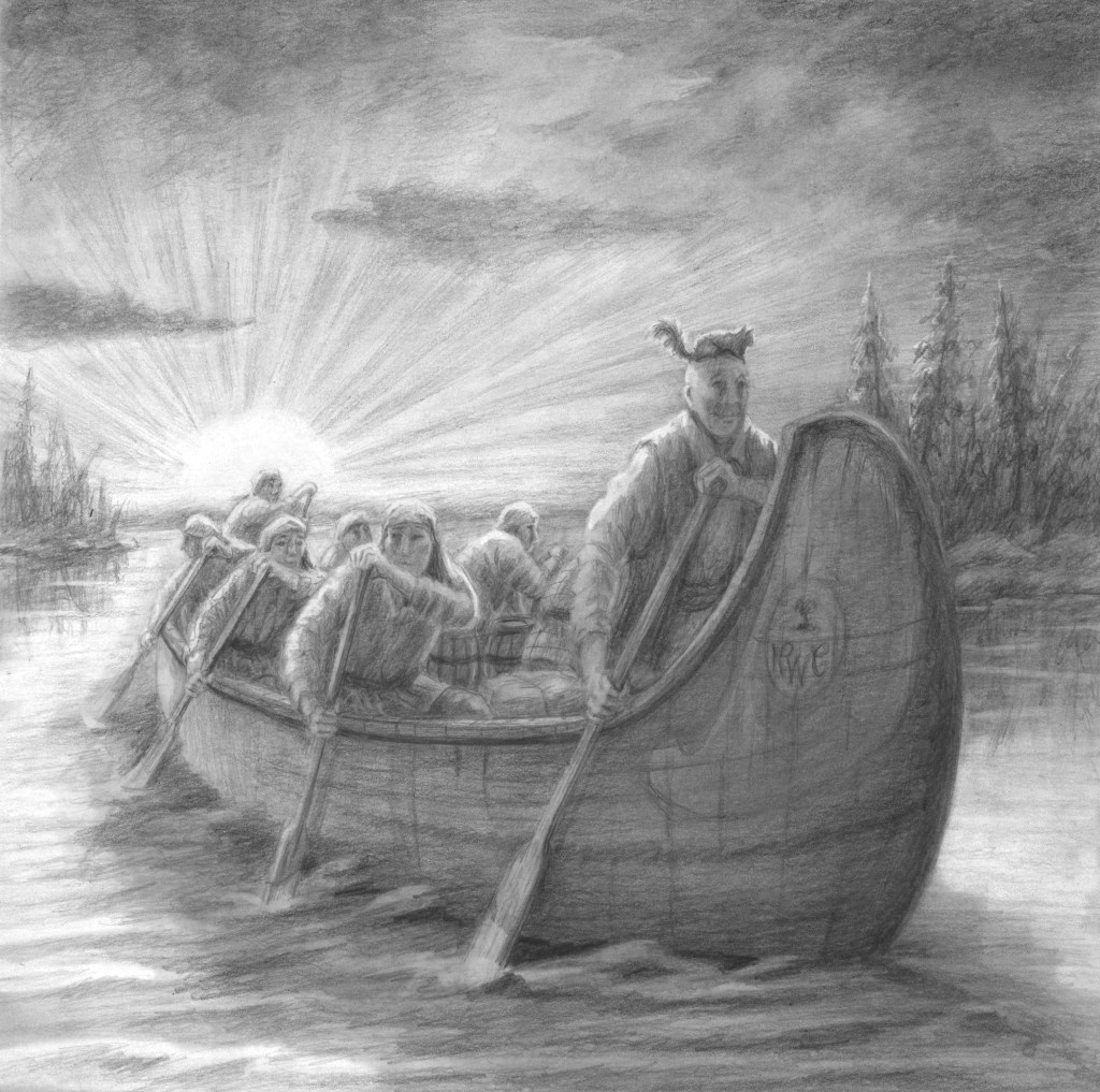 Since the illustrations needed to be historically accurate to depict events from llate 18th Century Canadian history, the first step was research. I’m a Texas native, so I had quite a bit to learn. I read lots of articles and stories and collected pictures of period clothing, birchbark canoes, landscapes, voyageurs, squirrels, and more.